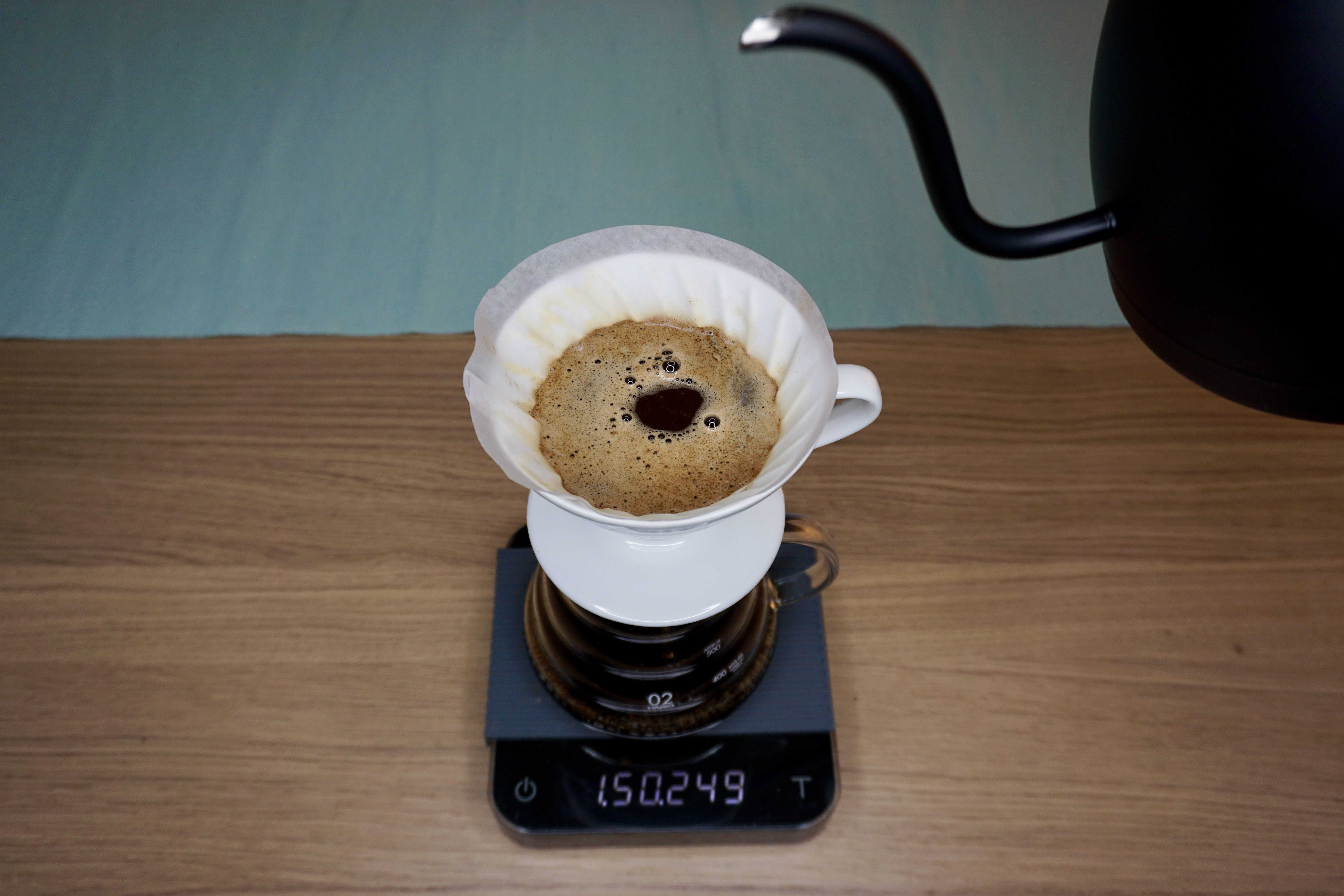 Starte den Timer und gieße langsam 30ml (bis maximal 45ml) Wasser direkt auf den Kaffee und warte bis insgesamt 45 Sekunden um sind. Achte hierbei darauf, dass der gesamte Kaffee benetzt wird. In der Blooming-Phase geben wir dem Kaffee die Zeit, dass das CO2 austreten kann (Blasen).